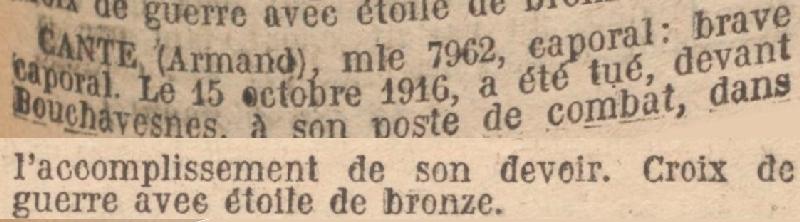 Croix de Guerre avec étoile de bronze 'Brave caporal le 13 octobre 1916 a été tué devant Bouchavesnes à son poste de combat, dans l'accomplissement de son devoir'.
