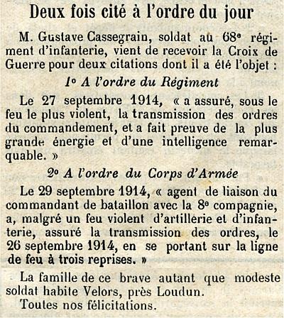 Cité ordre du 9e C.A. N° 28 'Agent de liaison du Commandant de Bataillon avec la 8e Compagnie, a, malgré un feu violent d'artillerie et d'Infanterie, assuré la transmission des ordres le 26 septembre en se portant sur la ligne de feu à 3 reprises'.