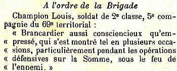 Cité à l'ordre de la Brigade d'Infanterie de la 61e Division le 13 Septembre 1916 N° 3 'Brancardier aussi consciencieux qu'empressé qui s'est montré tel en plusieurs occasions et particulièrement pendant les opérations d'offensive sur la Somme sous le feu de l'ennemi'.