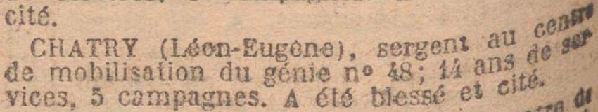 Ordre du Régiment n° 14 du 1er mai 1915 'Le téléphone ne fonctionnant pas par suite du bombardement n'a pas hésité à porter lui même à destination les renseignements réçus'.