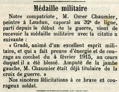 Médaille Militaire pour prendre rang du 20 Septembre 1915 (Décision Ministérielle du 8 Octobre 1915) avec ce motif 'Gradé animé d'un excellent esprit militaire et qui a fit preuve d'énergie et de courage au combat du 4 Février 1915 au cours duquel il a été blessé (Amputé de la jambe gauche).