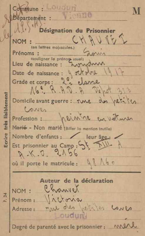 Prisonnier de guerre : Stalag XIII A AKO 2156 - Matricule 98160 - Rentré le 19 mai 1945.