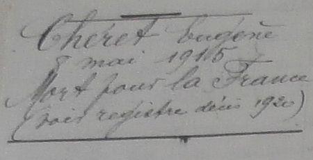 Incorporé (au 3e Bataillon de Chasseurs à Pied) à compter du 27 novembre 1913, arrivé au Corps le 28 du dit et Soldat de 2e classe.