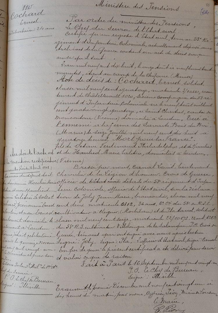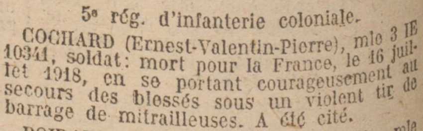 Tué à l'ennemi le 16 Juillet 1918 (Ferme des Savarts) - Avis du ministre en date du 19 Août 1918.