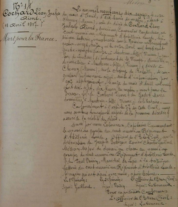 Mort pour la France le 11 avril 1917 à Chenay (Marne) Avis de déces 2138 AD bis du 2 mai 1917.