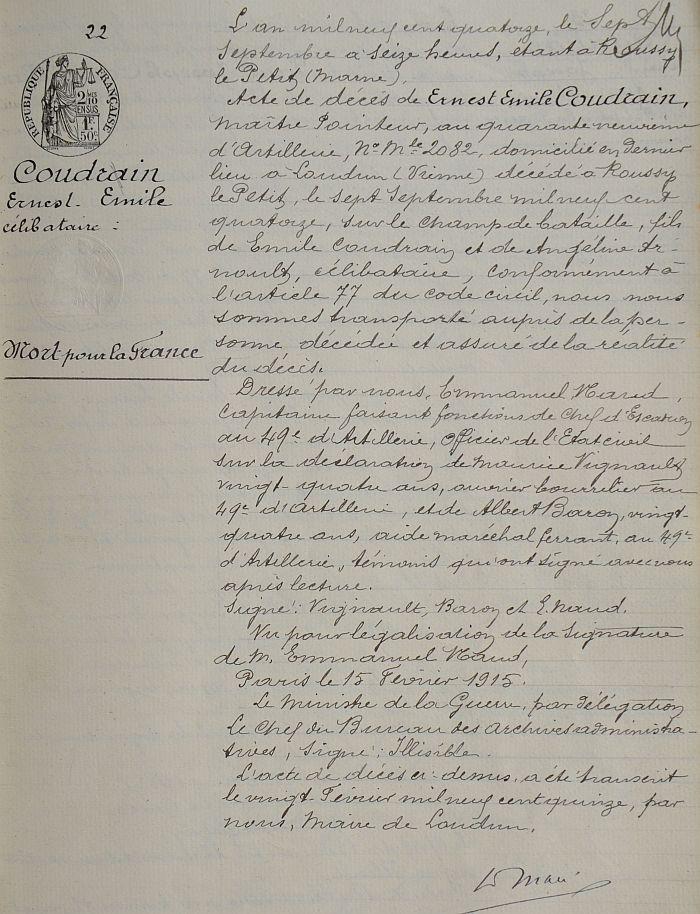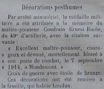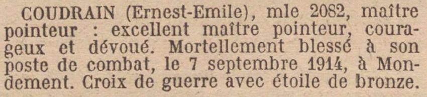 Tué à l'ennemi le 7 septembre 1914 au combat de Mondemont. Avis du ministre du 28 septembre 1914.
