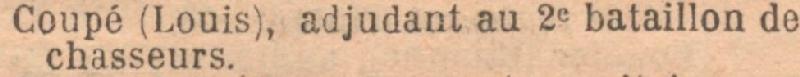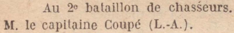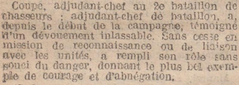 Cité à l'ordre N°31 du Bataillon en date du 12 Août 1918 'Officier d'un dévouement inlassable toujours à l'affût du plus grand bien-être à donner aux chasseurs du Bataillon dont il vient très souvent constater les besoins en première ligne. A assuré pendant la période de Juin à Août 1918 tout le service du ravitaillement dans des circonstances souvent fort pénibles' *A obtenu de M. le Sous-Secrétaire d'Etat à le Guerre le 30 Janvier 1918 une lettre de félicitation pour le zèle et le dévouement dont il a fait preuve dans l'organisation et fonctionnement des oeuvres coopératives de la troupe.