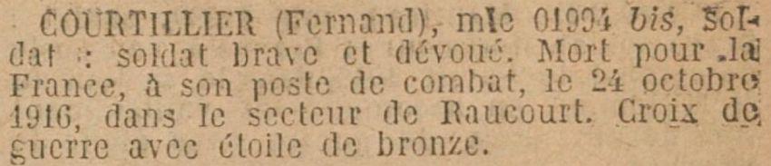 Tué à l'ennemi le 22 Octobre 1916 au nord du village de Rancourt (Avis officiel H.L. 2098 du 25 Novembre 1916).