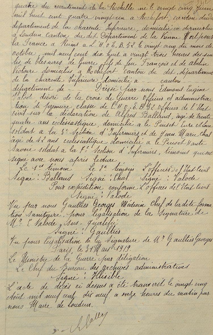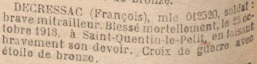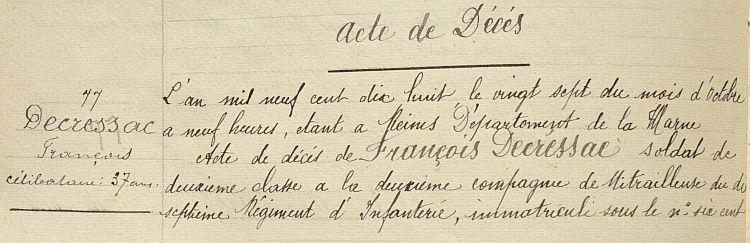 Décédé le 25 Octobre 1918 à l'hôpital E.R. 52 à Reims (avis officiel A.D. n° 26689 du 14/11/18).