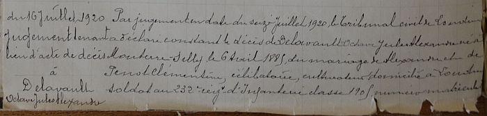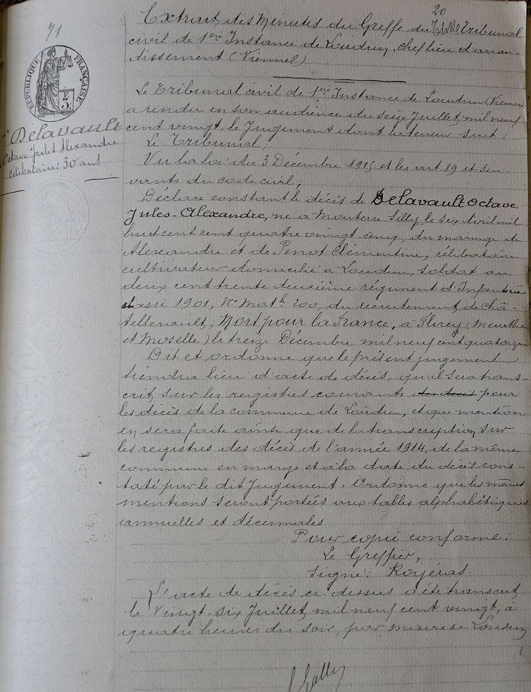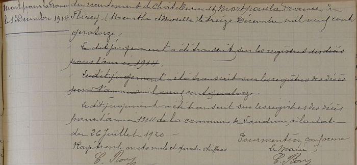 Déclaré Décédé le 17.12.1914 par jugement du Tribunal Civil de Loudun en date du 11 Juillet 1920.