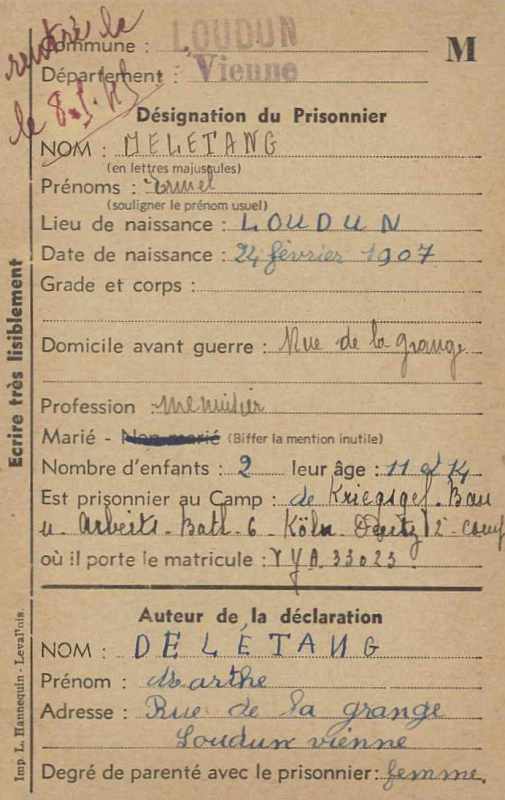 Interné au Stalag VI A N° Mle 33023.