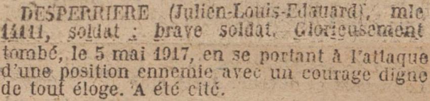Cité à l'ordre du Régiment N° 5 du 17 Mai 1917 "Glorieusement tombé le 5 mai 1917 en se portant à l'attaque d'une position ennemie avec un courage digne de tout éloge".