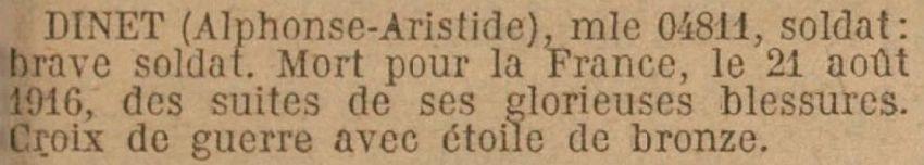 Tué à l'ennemi près Verdun le 21 Août 1916. (Avis officiel G.S. 2075 du 1er Septembre 1916).