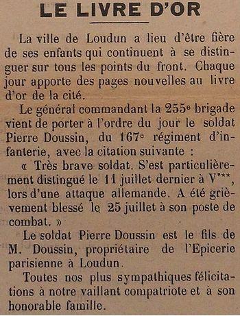 Cité à l'ordre de la Brigade N° 66 en date du 18 avril 1916 'Soldat très brave a été grièvement blessé le 14 Juillet 1916 à son poste de combat'.