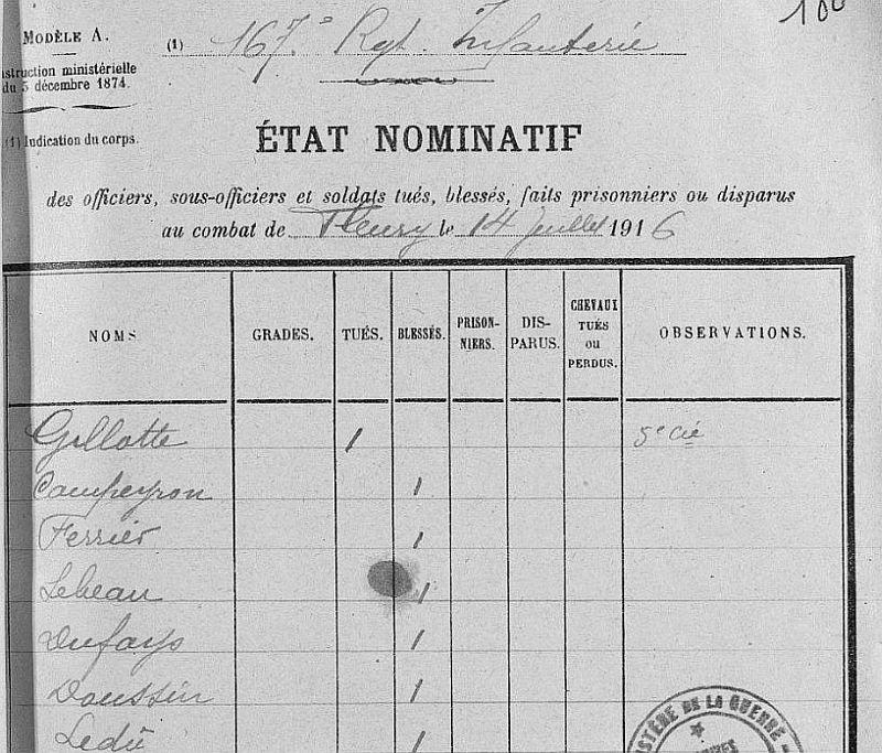 passé au 167e Régiment d'Infanterie le 27 Mars 1916.