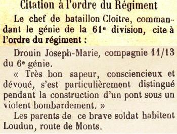 Cité à l'ordre du Régiment N° 109 de la 61e D. en date du 26 Novembre 1918 'Très bon sapeur, conciencieux et dévoué, s'est particulièrement distingué pendant la construction d'un pont sous un violent bombardement'.