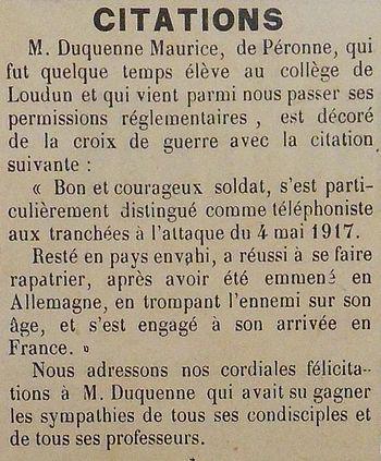 Citation à l'ordre du régiment n° 59 du 10 Mai 1917 'Téléphoniste au grope, bon et courageux soldat s'est distingué spécialement comme téléphoniste au détachement de liaison avec l'infanterie pendant l'attaque du 4 mai. Resté en pays envahi et emmené par les allemands en captivité a réussi à se faire rapatrier grâce à un subterfuge et s'est engagé aussitôt en France'.