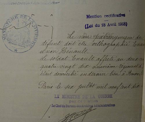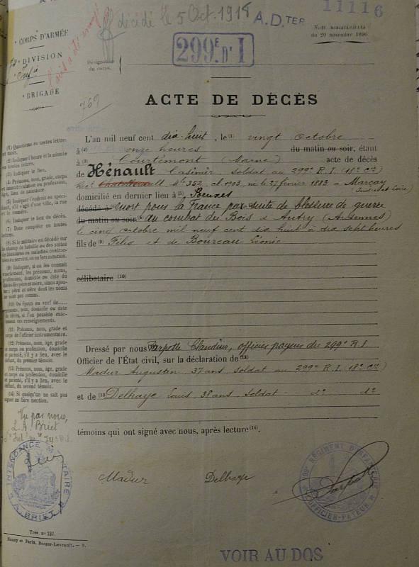 Tué à l'ennemi le 5 Octobre 1918 à Bouconville ( Ardennes) avis du Ministère de la Guerre du 24 Octobre 1918 (N° E.P. bis 45240c).