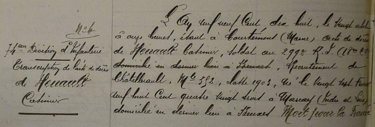 Dirigé le 15 Novembre 1904 sur le 32e Régiment d'Infanterie, arrivé au Corps le dit jour N° Mle 5367.