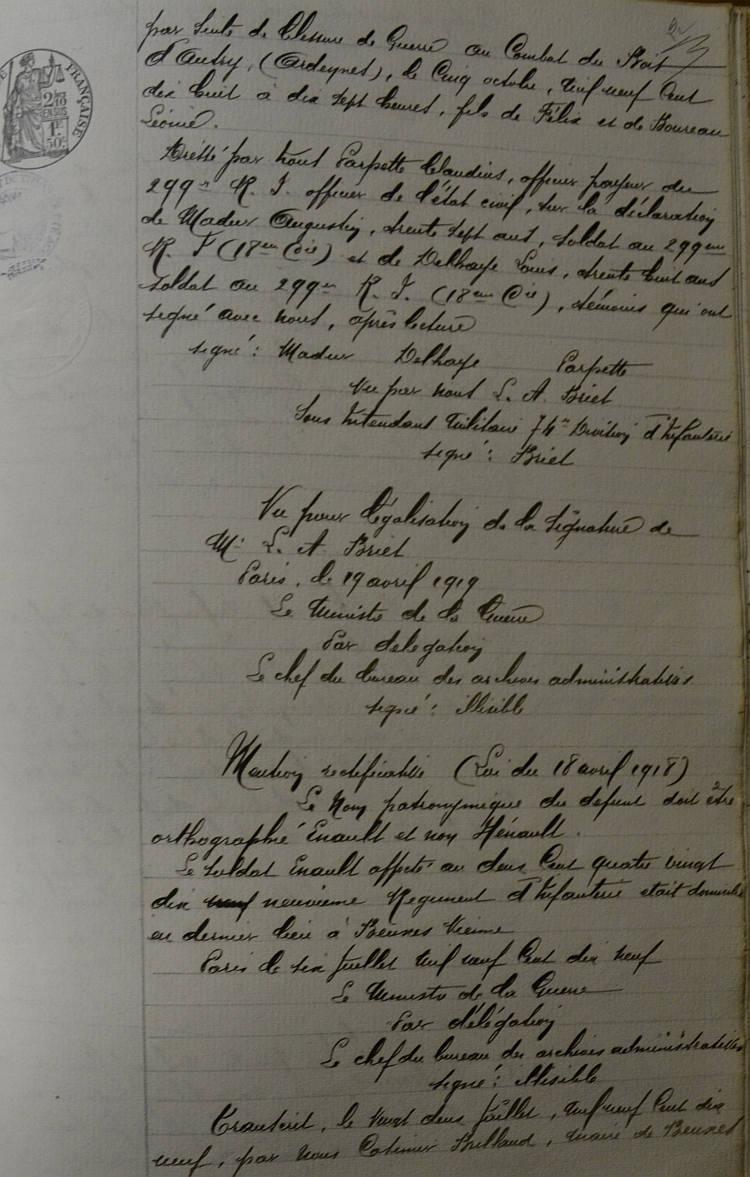 Passé au 299e Régiment d'Infanterie le 8 Juin 1918.