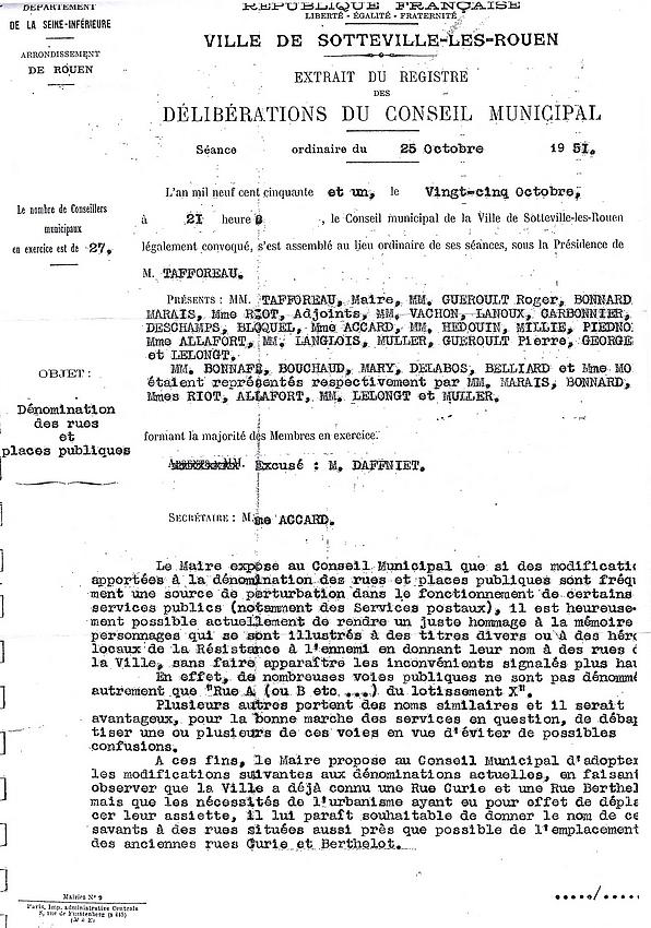 Document : Mairie de Sotteville-les-Rouen Délibération du Conseil Municipal de Sotteville-les-Rouen du 25 Octobre 1951