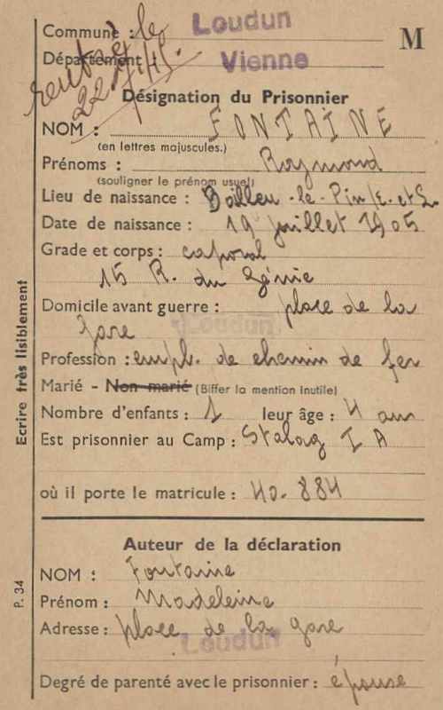 Résidence : Place de la gare. Employé de chemin de fer. Caporal au 15e Régiment du Génie. Prisonnier de guerre : Stalag I A - Matricule 40 884 - Rentré le 22 juillet 1945.