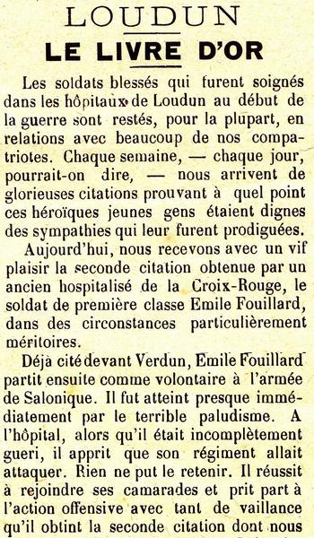 Ordre du Régiment N° 169 du 29-4-1916 'Le 20-4-1916 malgré un violent tir de barrage a assuré la liaison de leur section et a permis ainsi à la Compagnie de prendre ses nouveaux emplacements. Très courageux et très dévoué.'