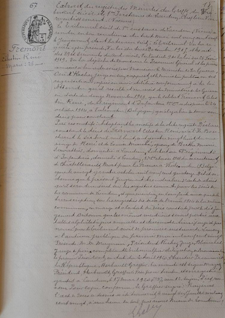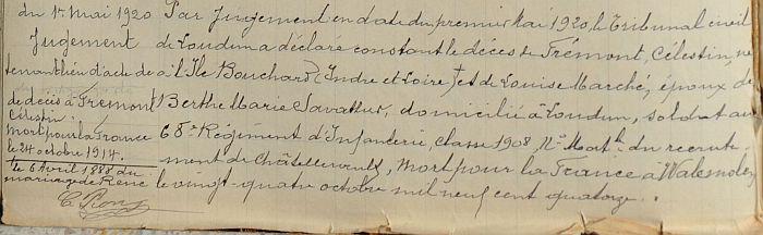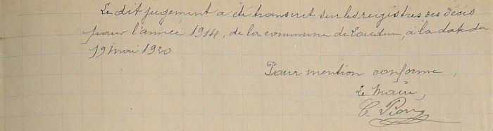Décès fixé au 24 Octobre 1914 par jugement déclaratif du Tribunal Civil de Chinon du 26 Août 1920.