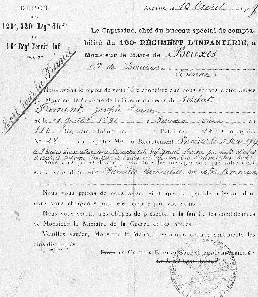 Tué à l'ennemi le 5 Mai 1917 aux tranchées de Sapigneul (Marne) par éclats d'obus. Avis Ministériel du 6 août 1917 ADN N° 9678.
