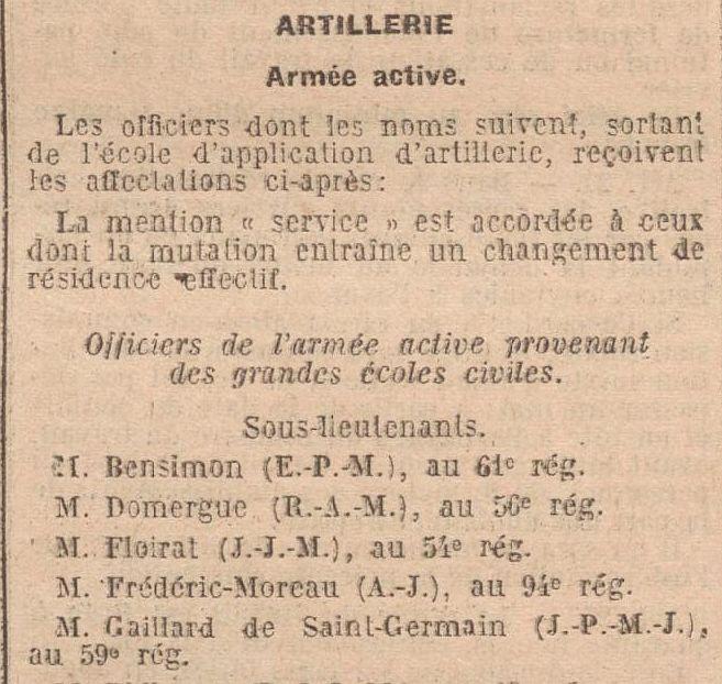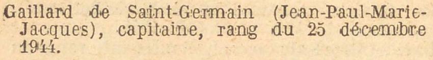 "Jeune officier d'une très belle valeur morale. A par son activité et ses connaissances rendu des services inappréciables à la cinquième batterie. S'était déjà distingué à la quatrième batterie dans les opérations de la boucle de la Blies"