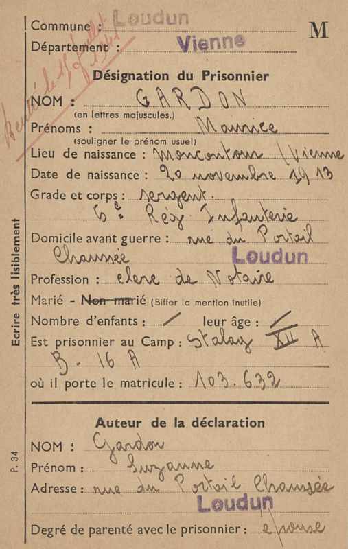 Sergent au 5e Régiment d'Infanterie. Prisonnier de guerre : Stalag XII A B 16 A - Matricule 103632 - Rentré le 15 juillet 1941.