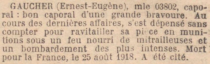 Citations: Cité à l'ordre du Régiment n° 324 du 6 Juillet 1918. Vieux mitrailleur qui depuis le début de la guerre encourage ses camarades par l'exemple de ses qualités militaires a remplacé son chef de pièce grièvement blesé continuant à infliger à l'ennemi des pertes sérieuses ne s'est replié que sur l'ordre de son chef de section en emportant son matériel'.