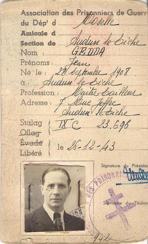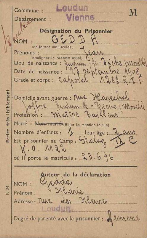 Prisonnier de guerre : Stalag IX C - KO 1122 - Matricule 23696 - Libvéré le 26 décembre 1943.