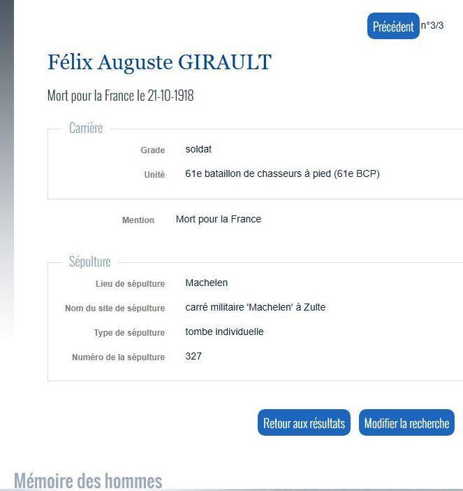 Mort pour la France, avis Mel n° A.D. 26317 du 9 novembre 1918.