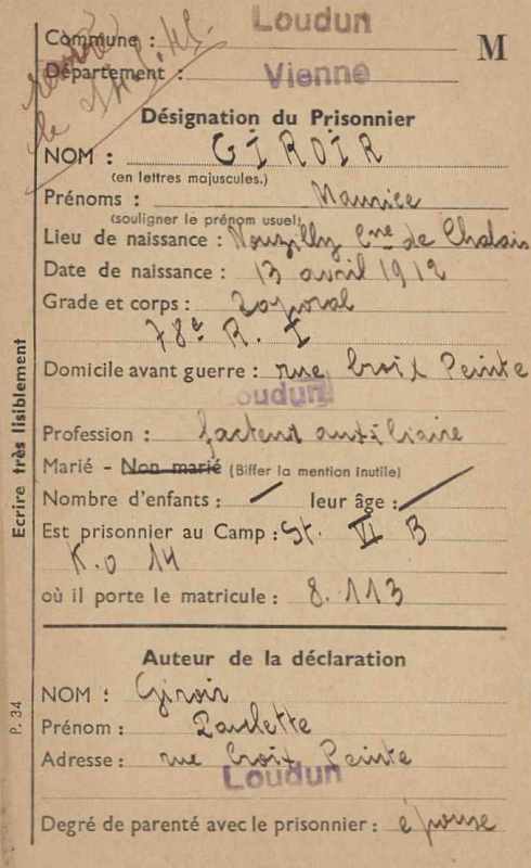 Prisonnier de guerre : Stalag VI B KO 14 - Matricule 8113 - Rentré le 14 mai 1945.