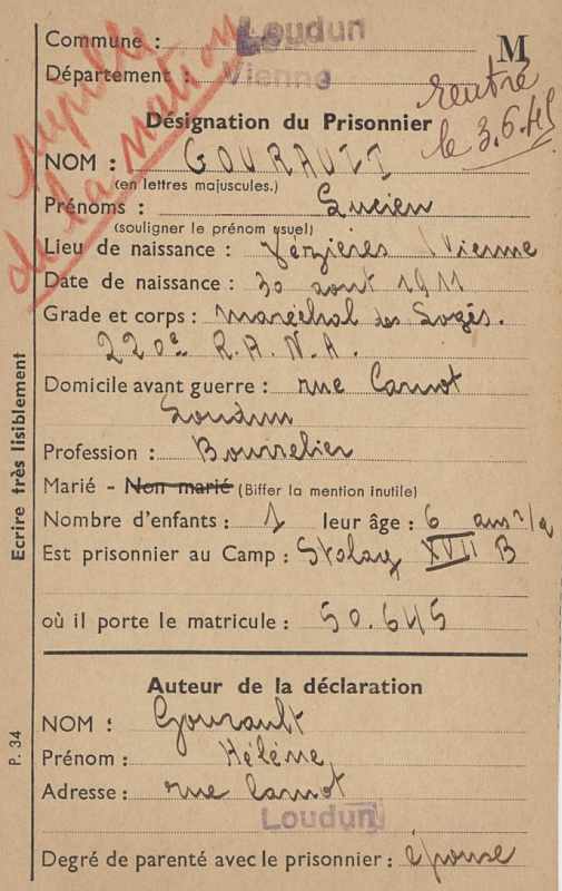 Prisonnier de guerre - Stalag XVII B - Matricule 50645 - Rentré le 3 juin 1945.