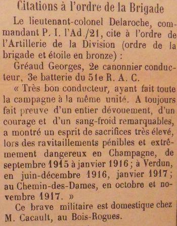 Cité à l'ordre de l'A.D/21 du 14 décembre 1918 'Très bon conducteur ayant fait toute la campagne à la même unité. A toujours fait preuve d'un entier dévouement d'un courage et d'un sang-froid remarquables. A montré un esprit de sacrifice très élévé lors des ravitaillements pénibles et extrêmement dangereux en Champagne de septembre 1915 à janvier 1916. Verdun en Juin-Décembre 1916 Janvier 1917, au Chemin des Dames en Octobre et Novembre 1917'.