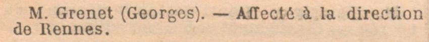 Affecté à la Direction de Rennes (Décision Ministérielle du 25 Septembre 1907).