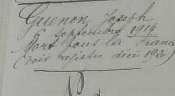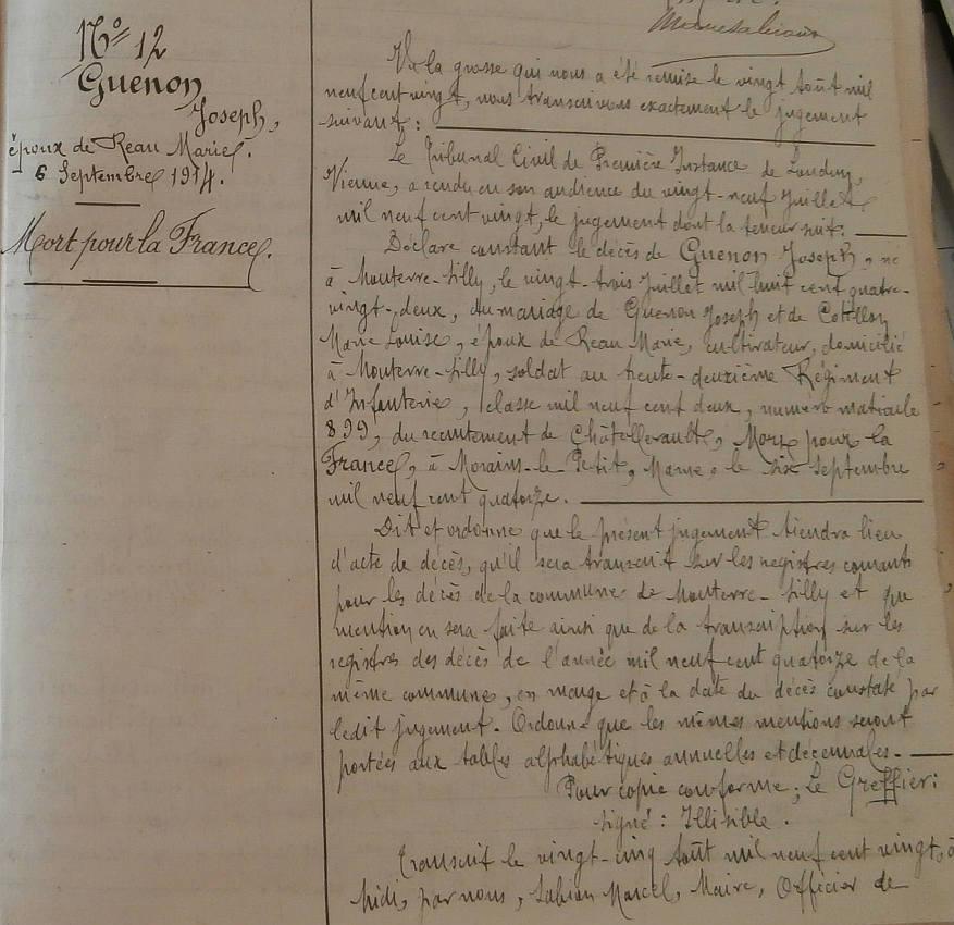 Déclaré décédé le 6 Septembre 1914 à Morin le Petit par jugement du tribunal civil de Loudun en date du 29 juillet 1920.