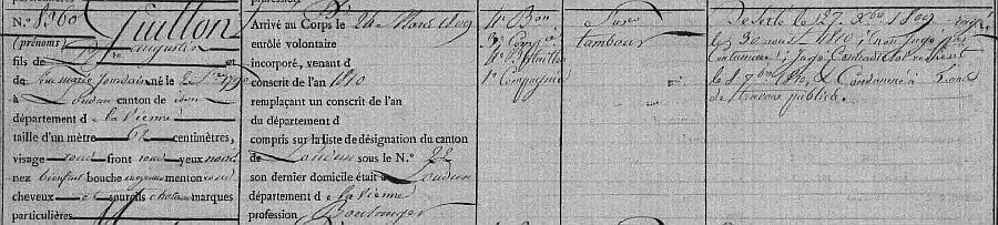 Fusilier Tambour au 45e régiment d'infanterie de ligne, 4e Bataillon 3e Compagnie puis 4e Bataillon 1ère Compagnie.