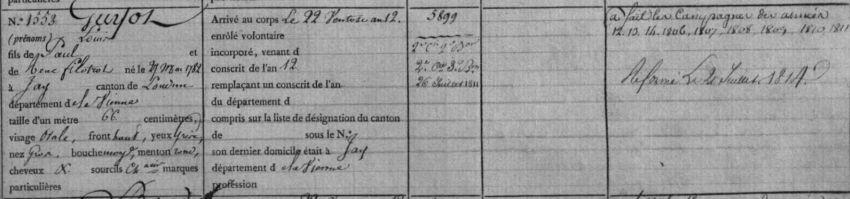 A fait les campagnes des années 12, 13, 14, 1806, 1807, 1808, 1809, 1810 et 1811.