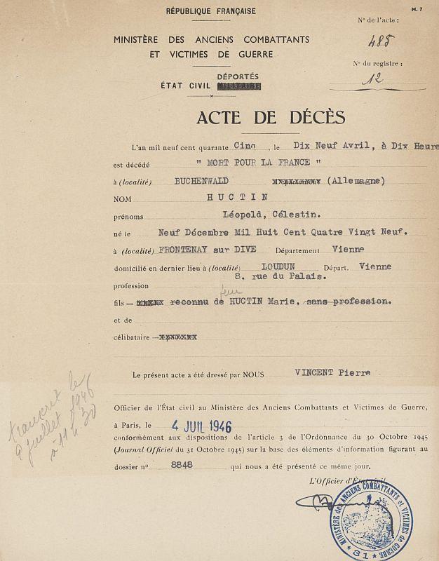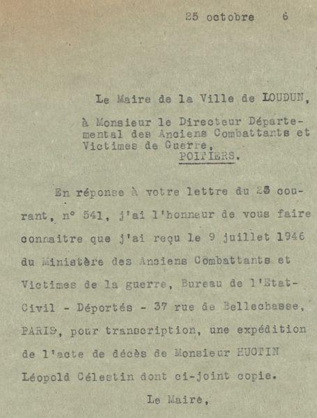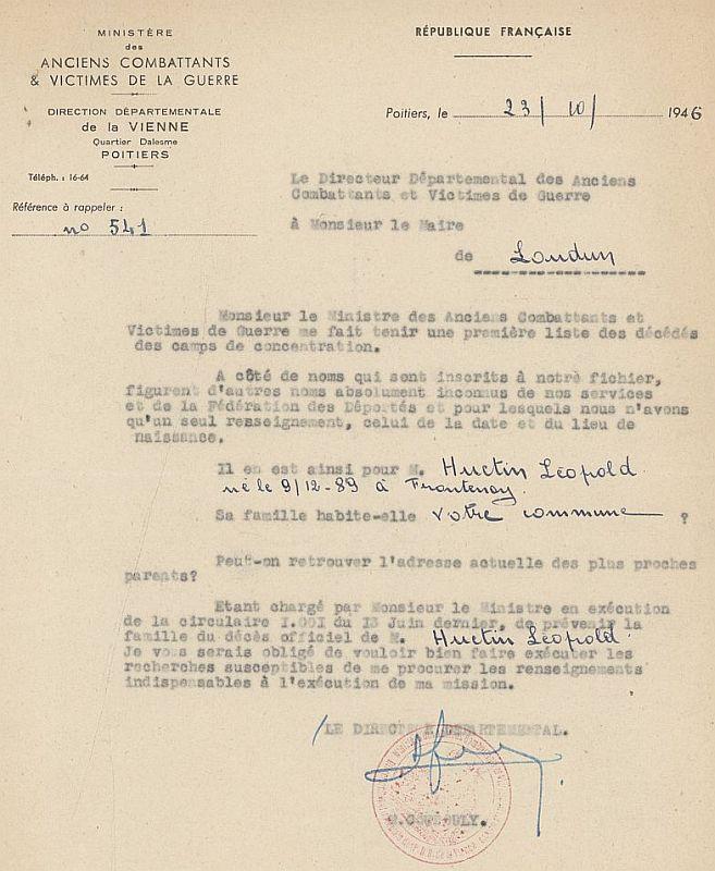 Léopold HUCTIN est né le 9.12.1889 à Frontenay. Ex-cheminot à Loudun, célibataire, habite 8 rue du Palais à Loudun, ex-trésorier de la cellule communiste, « Son activité politique était modérée… Vieux garçon il passait pour avoir parfois des idées de « célibataire endurci ». Serviable il n’était point détesté à Loudun. »