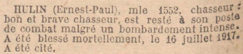 Citation : N° 10 de la 310e Brigade du 18 juillet 1917. Brave et bon chasseur est resté à son poste de combat malgré un bombardement intense a été mortellement blessé.