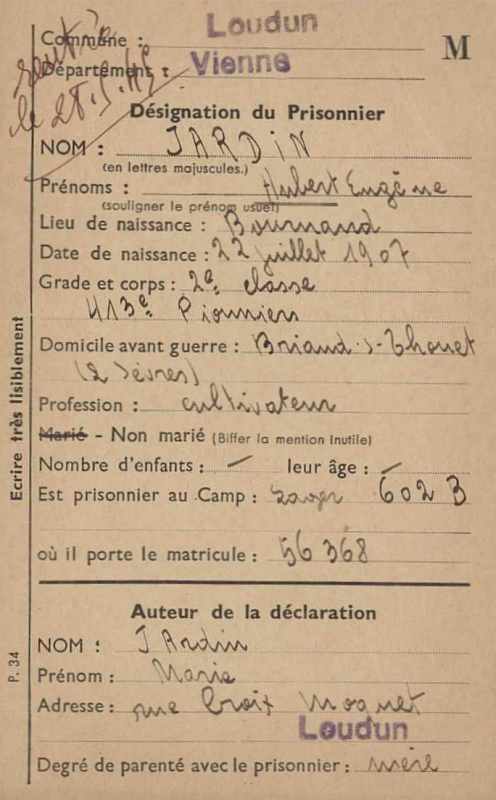 Prisonnier de guerre : Lager 602 B - Matricule 56368 - Rentré le 28 mai 1945.