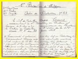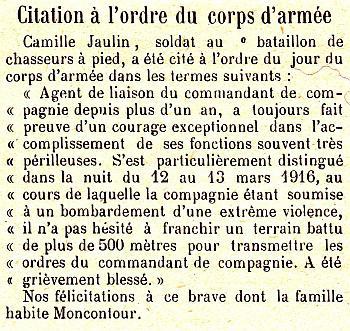 Citation à l'ordre n° 86 du 21e C.A. du 29 mars 1916 'Agent de liaison du Commandant de Compagnie depis plus d'un an, a toujours fait preuve d'un courage exceptionnel dans l'accomplisement de ses fonctions souvent très périlleuses. S'est particulièrement distingué dans la nuit du 12 au 13 Mars 1916, au cours de laquelle la compagnie était soumise à un bombardement d'une extrême violence et n'a pas hésité à franchir un terrain battu de plus de 500 mètres pour transmettre les ordres du Commandant de Compagnie. A été très grièvement blessé au bras gauche par éclat d'obus'.