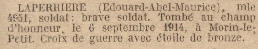 Mort pour la France à Morains-le-Petit (Marne) le 6 Septembre 1914.