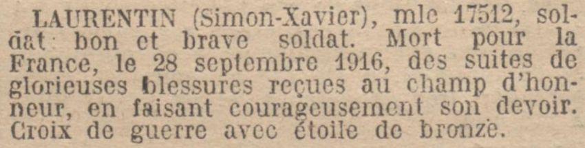 Décédé le 28 Septembre 1916 à l'Hôpital Rollin VE 22 à Paris. Syncope cardiaque au cours d'anesthésie suites des blessure de guerre par éclat d'obus reçue le 6 Septembre 1916.
