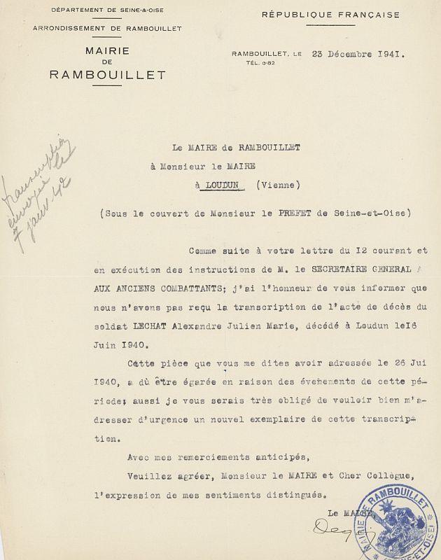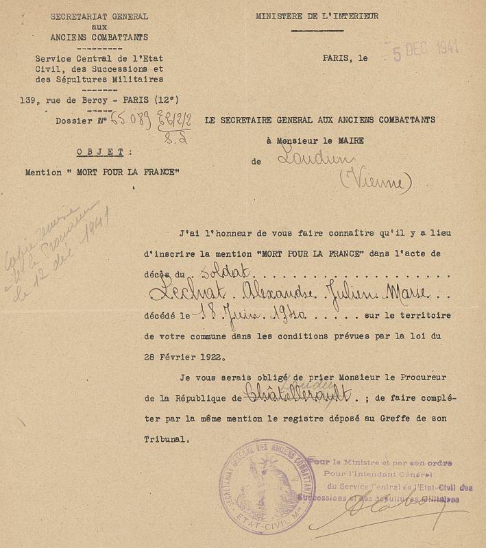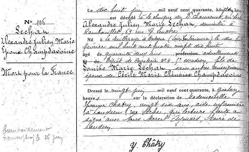 Décédé à Loudun le 20--6-1940 suite de bombardement aérien.