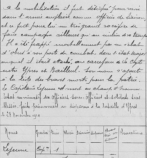 Blessure de Guerre : Grièvement blessé le 23 Novembre 1914 au combat de la Clytte (Belgique) et décédé le même jour de suite de ses blessures à l'hôpital de Bailleul.