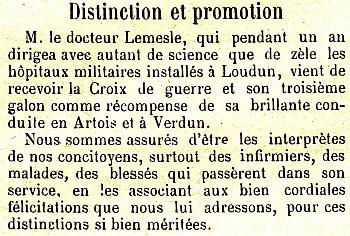 Promu au grade de médecin major de 2e classe de l'Armée Territoriale par décret du 10 Août 1916 (J.O. du 22 Août 1916).